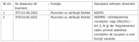 Având în vedere prevederile art.15 lit. a) din Hotararea Guvernului nr.286/2011 cu modificările si completările ulterioare-Regulamentul cadru privind stabilirea principiilor generale de ocupare a unui post vacant sau temporar vacant corespunzător funcţiilor contractuale din sectorul bugetar plătit din fonduri publice, comisia de concurs constituită prin decizia nr.51/03.06.2022, comunică urmatorul rezultat al selecţiei dosarelor de înscriere: